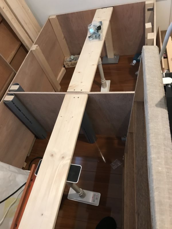 間に板をかませて2×4工法、的な感じ。でも、寝てて落ちちゃうと困るので中にも板を通し、つっぱりに地震用のツッパリ棒を使いました。あと、水道管のパイプも同じ高さでカットして要所要所を支えるようにしました。