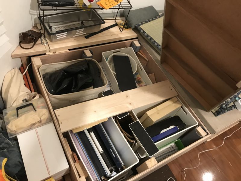 ここで寝るわけですが、荷物もメタルラックには乗り切らず(もちろんクローゼットも服とかいろいろ入っていてこれ以上、無理)、寝床にもなり、かつ収納力抜群というと、日本が昔から誇る多機能収納型寝台、【小上がり】の出番なわけですね。