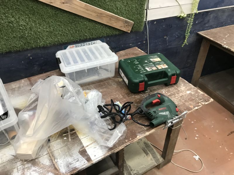 ホームセンターのカットサービスを利用して、大まかなパーツは加工します。特に正確なカットが必要な縦のカットなどは非常に便利です。変形部分の加工や細かい仕上げは、ホームセンター内のレンタル工具を使用して行いました。