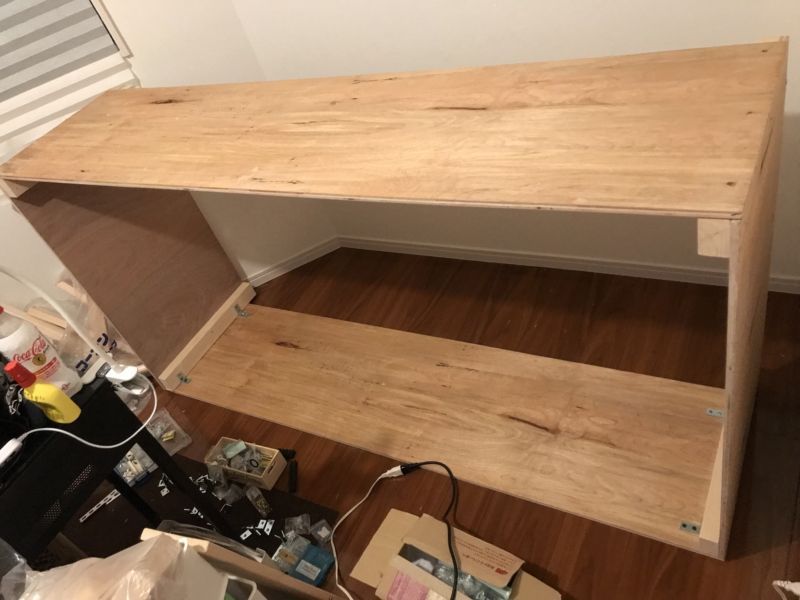 奥左手に見えるのが走り書き設計図。おおむねのパーツはカットサービスで切ってもらい、細かい部分(変形はカットしてくれない)やサンドペーパー掛けなどはホームセンター内のレンタル工具で作業ルームでやりました。上記写真はコンパネを支えたりつなぐ部分の柱をカットしている写真です。コンパネ自身はカットサービス利用です。ちなみに1カット30円とかでやってくれます。